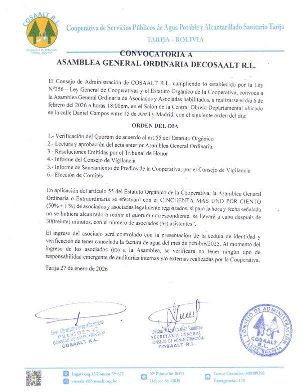 El consejo de Administración de Cosaalt r.l. cumpliendo lo establecido por la ley N 356 - Ley General de Cooperativas y el Estatuto Organico de la Cooperativa, convoca a la Asamblea General Ordinaria de Asociados y Asociadas habilitados, a realizarse el dia 6 de febrero 2026 a horas 18:00 pm, en el Salon de la Central Obrera Departamental ubicado en la calle Daniel Campos entre 15 de Abril y Madrid.