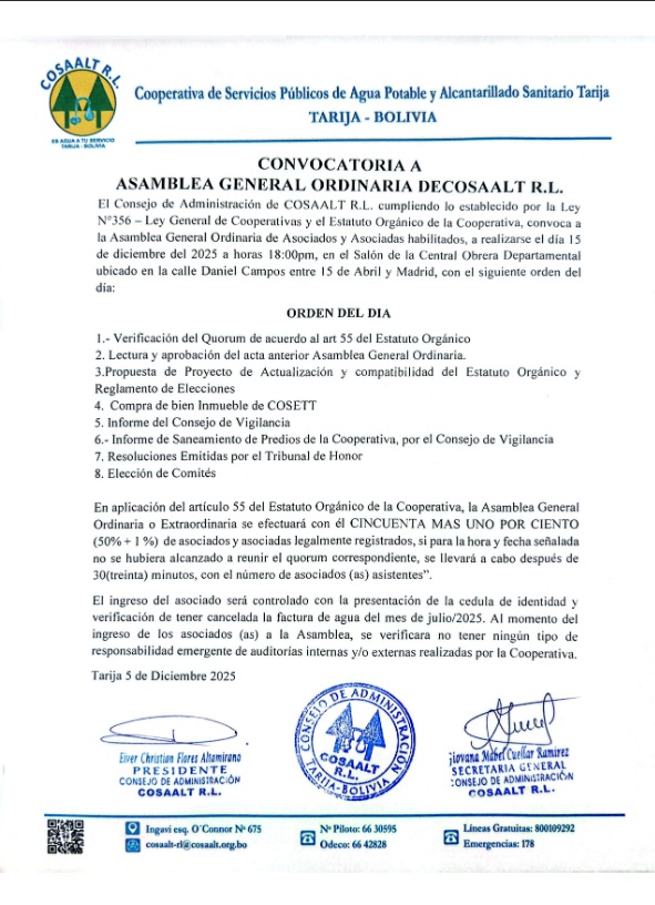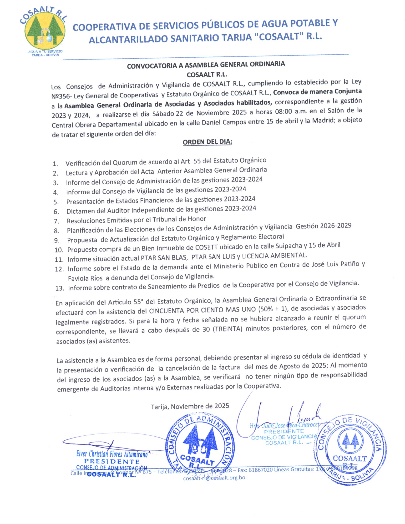 Los Consejos de Administración y Vigilancia de COSAALT R.L., cumpliendo lo establecido por la ley Nro 356 - Ley General de Cooperativas y Estatuto Orgánico de COSAALT R.L. Convoca de manera Comjunta a la Asamblea General Ordinaria de Asociadas y Asociados habilitados, correspondiente a la gestión 2023 y 2024, a realizarse