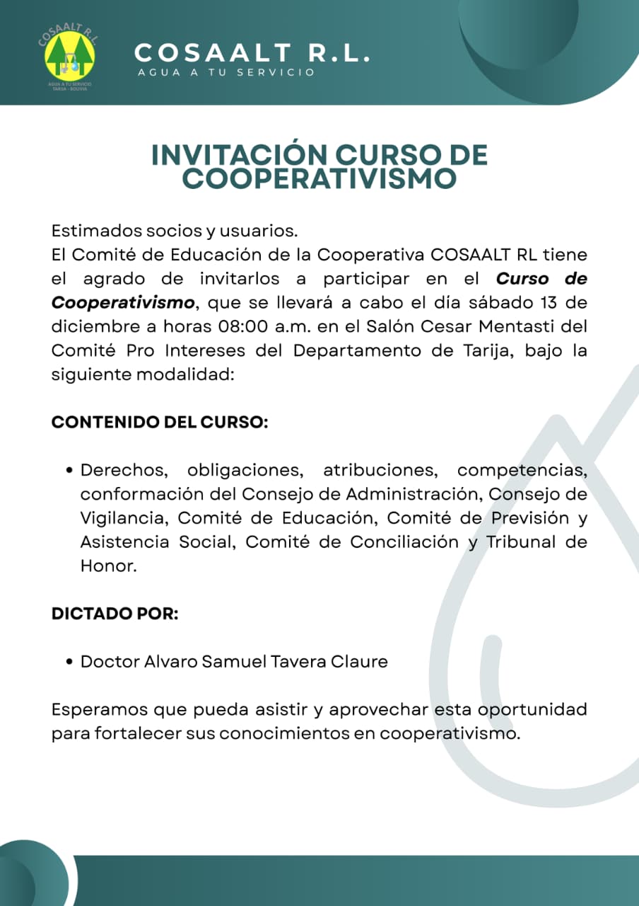 El comité de Educación de la Coopertaiva Cosaalt RL tiene el agrado de invitarlos a participar del Curso de Cooperativismo, que se llevará acabo el dia sábado 13 de diciembre a horas 08:00 en el salón Cesar Mentasti del Comité Pro Intereses del Departamenteo de Tarija.