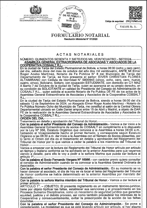 Publicacion del ACTA DE LA ASAMBLEA GENERAL ORDINARIA DE ASOCIADAS Y ASOCIADOS DE LA COOPERATIVA COSAALT R.L. de fecha 23 de sepiembre de 2024.